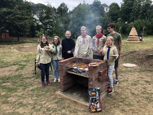Der von den Rovern gebaute Grill im Netzwerkgarten (siehe hier) wurde im Rahmen der letzten Gruppenstunde vor den Sommerferien eingeweiht.